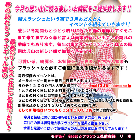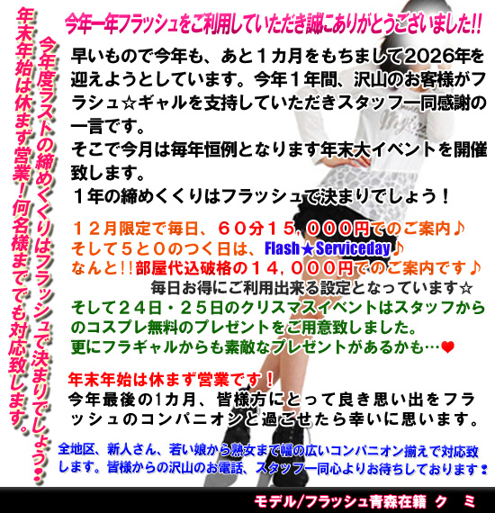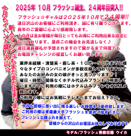 青森県内にフラッシュありと言われ続けて数年が経ちました。現在では青森県は基より東日本で敵無しと自負して営業しています。系列、グループ店が他県にもあります。どのエリアでもフラッシュは強いです。そんなフラッシュがこの度、むつエリアへ入ります。フラッシュ最大の売りはどのエリアでもコンパニオン数です。むつエリアも制覇する自信があります。在籍しているコンパニオンですが、通常コースから人妻コースに至るまで幅広く在籍しました。団体様でもご案内する自信があります。むつ地区のお客様はフラッシュというビックネームは当然の如くご承知だと思います。フラッシュのコンパニオンを呼んで見て下さい。